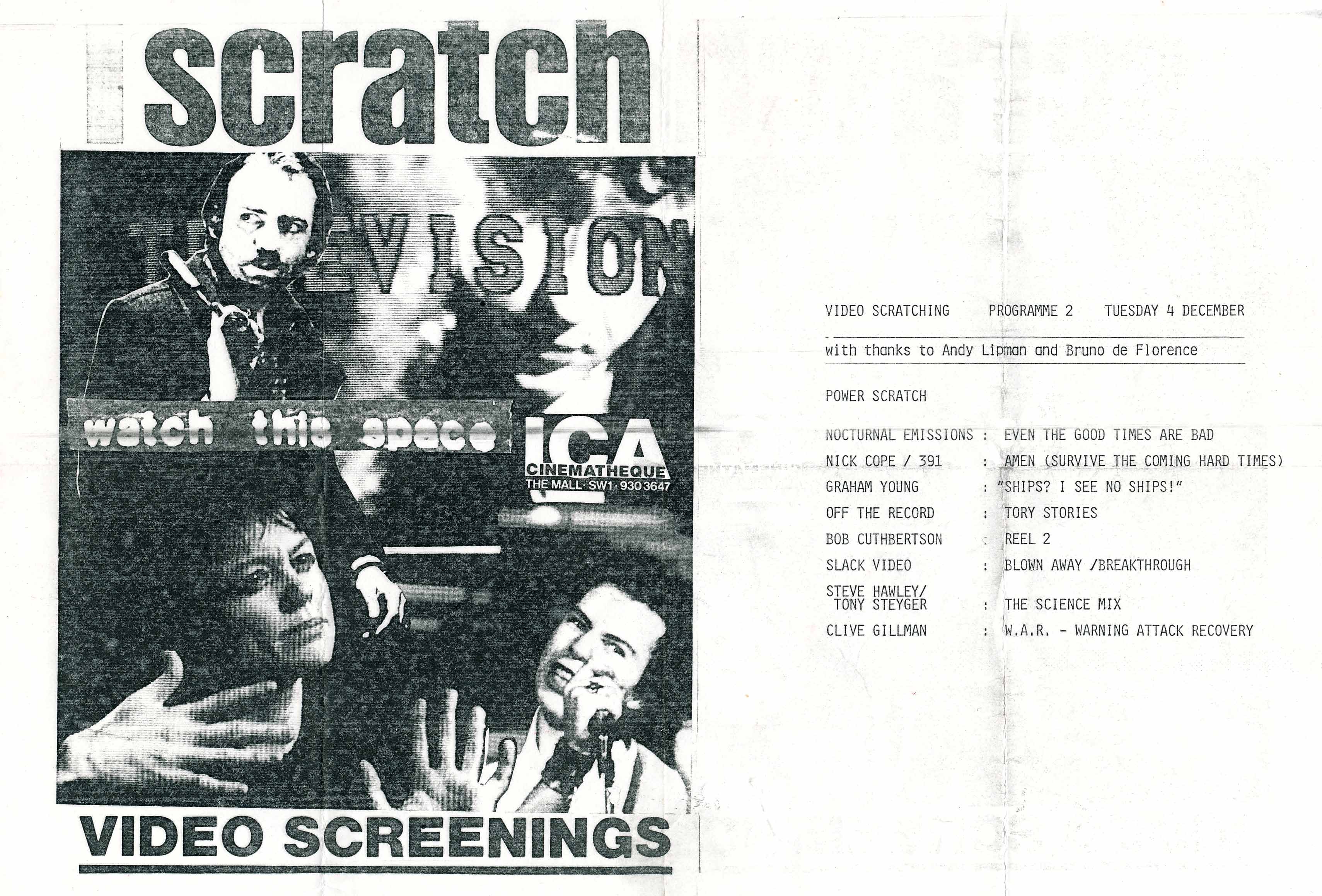 Scratch Television, ICA screening programme, 1984; featuring Nick Cope/391: Amen (Survive the Coming Hard Times).