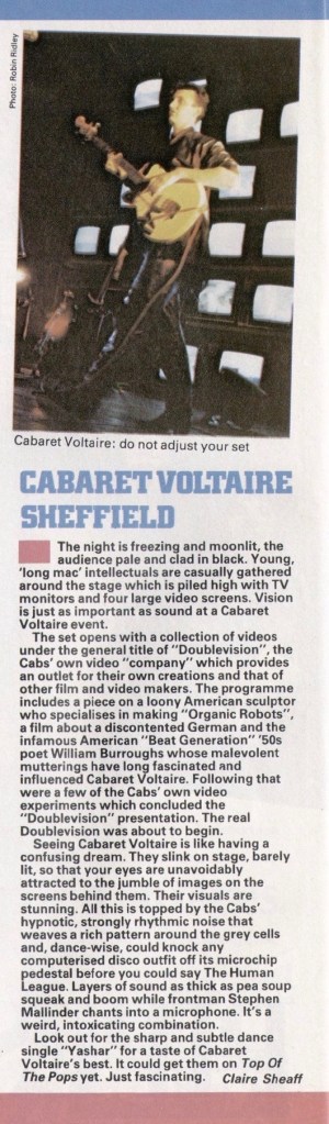 I’d first worked with Cabaret Voltaire in November 1983, assisting in setting up a video wall of old TV monitors for their showpiece gig at the recently opened Octagon Theatrre, University of Sheffield; and manning a live camera on stage, as Paul Smith co-ordinated a mix of video footage with the camera feed to the ‘videowall’ at the rear of the stage. An ambitious and pioneering audiovisual technical set-up at that time.