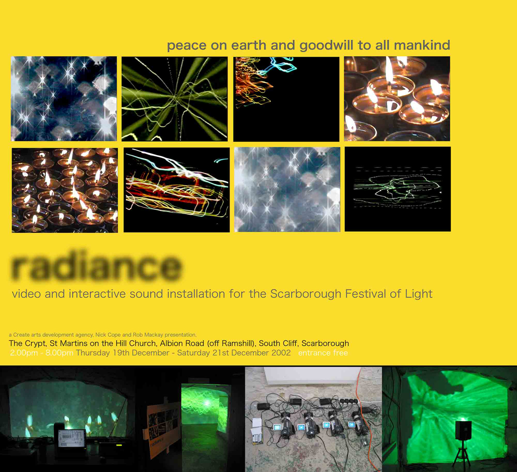 Commissioned for the Scarborough Festival of Light, with funds from Yorkshire Arts and Scarborough Borough Council, Radiance was situated in the Crypt of St Martin’s-on-the-Hill, South Cliff, Scarborough, from the 19th – 21st December 2002. The name of the installation comes from the words of Joseph Campbell: ‘The one radiance shines through all things’, which are used within the soundscape itself. A combination of video projections sought to celebrate and investigate light in its manifest forms, from the distracting and mesmerising light of the city at night, computer graphics and fairgrounds, through the magnificence of light in nature to the meditative presence of the candle flame. The installation was designed as a kind of maze through which the audience moved, encountering these different manifestations of light and being drawn in from the confusing and disorientating lights of urban realms to a more calm and contemplative inner space. The audience is taken on a sonic journey too, from the hustle and bustle of the world outside, through to sounds of nature, and eventually into the last, more reflective space in which quotes from Joseph Campbell can be heard alongside Western sounds of choir and organ with Eastern chants of Tibetan monks and prayer bells. This space contained a stereo soundscape which positioned the sounds of the organ and choir on the West and the sounds of the Tibetan monks chants and prayer bells on the East. These two sides were linked by similarities in pitch and texture to create a unified whole. Rob MacKay used the natural acoustic properties of the space to produce a gradually evolving soundscape. With the use of interactive controllers (soundbeams and touch sensor), the audience themselves interacted with the environment as they passed through, to add another layer to the evolving soundscape (see also the Create website).