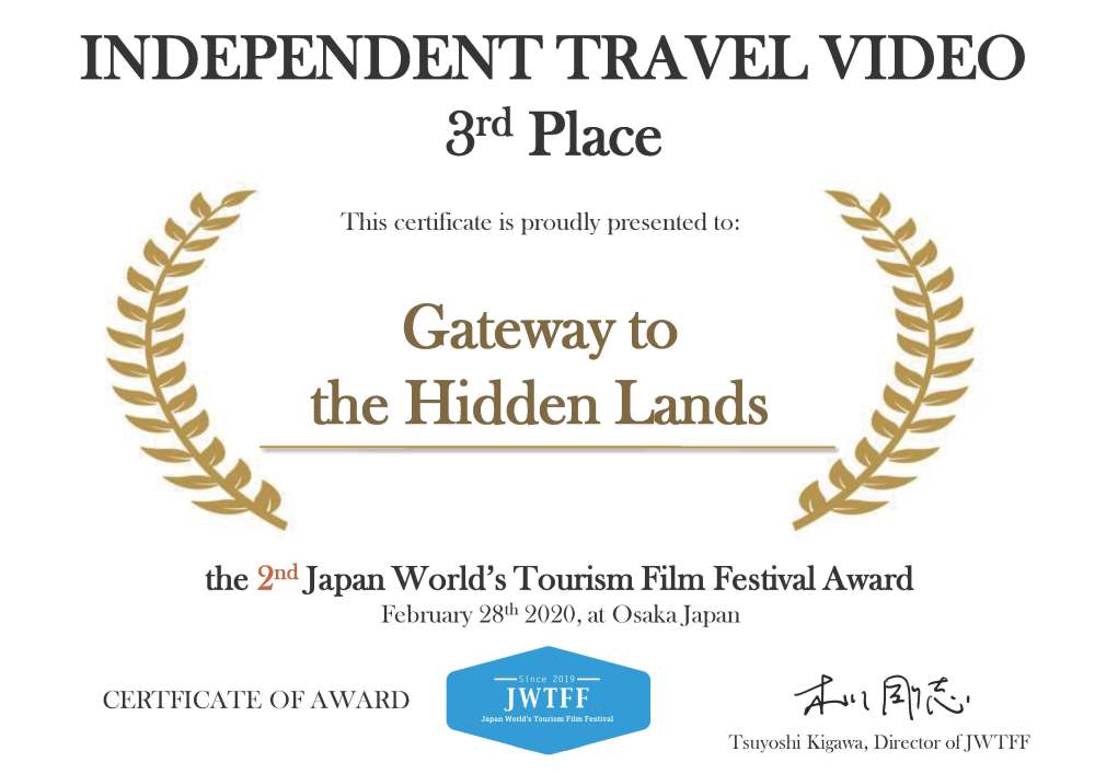 Winner: Best Independent Travel Video; Bronze Medal – Gateway to the Hidden Lands, Japan World’s Tourism Film Festival, Osaka, Japan, 27-28 February 2020.